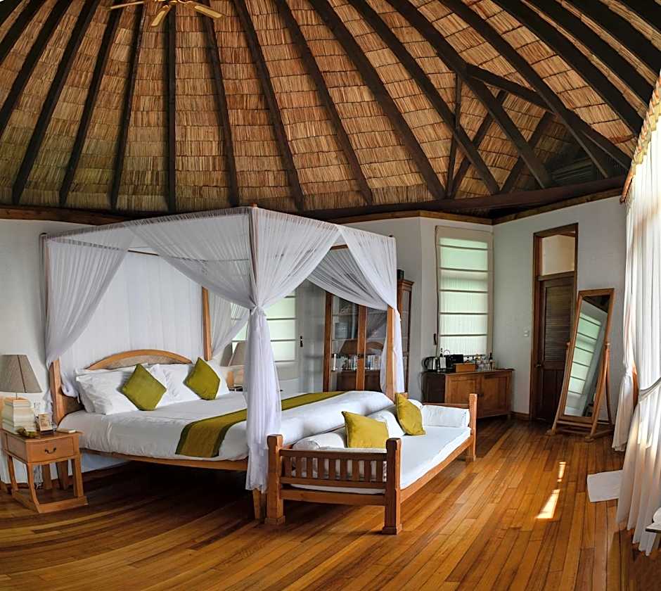 The spacious bedrooms feature a high-pitched ceiling, air-conditioning and an overhead fan. Each villa has a private terrace with outdoor seating and open-air garden bathrooms.